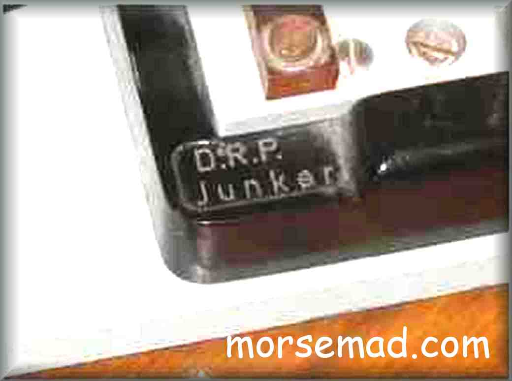 A close-up of markings showing "D.R.P. Junker".. On the right can be seen the key complete with its original equipment cable assembly. Beneath the bakelite lever are the markings "V1" and "S" followed by the numbers" 93391", followed by "Ph".