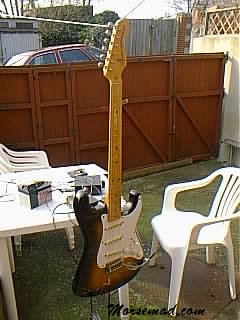 ![]() | On the left is a Fender Guitar that I have successfully used as an antenna for recieving and transmitting morse code on the 28Mhz band. Using a QRP rig, a home brew ATU, a short length of coax clipped onto the strings and powered from a 12v battery. I tried to work the D68C Comoros Islands expedition. Could hear them but they didn't hear me (wonder why ?) so resorted to working Roger-G0OFA and Dave-G0WWD who both live within 5 miles of me. |