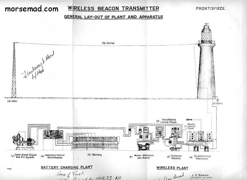 A fasinating workshop handbook for the WIRELESS BEACON TRANSMITTER (WB2 TX) for Flamborough Head Light House. The station code was "FB" sent in morse code (during fair weather) every 6 minutes on 289Kc/s. The wavelength of transmission was 1,000 meters, and the system of transmission was that known as Interrupted Continuous Wave (I.C.W.) During fog weather the signal was repeated once every 4 minutes. The morse letters "FB" were repeated continuously for approx. 48 seconds, followed by a prolonged dash of 10 seconds duration and finally by one repetition of the call sign ("FB"), the whole transmission occupying a total period of exactly 60 seconds.