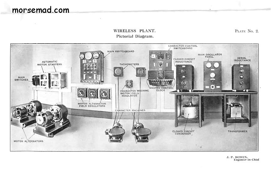 This final example from the book is the "WIRELESS PLANT. Pictorial Diagram". The Marconi key AS300A would have been connected to the Main Switchboard - (the large wall mounted fixture to the left of center).