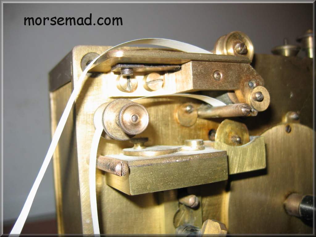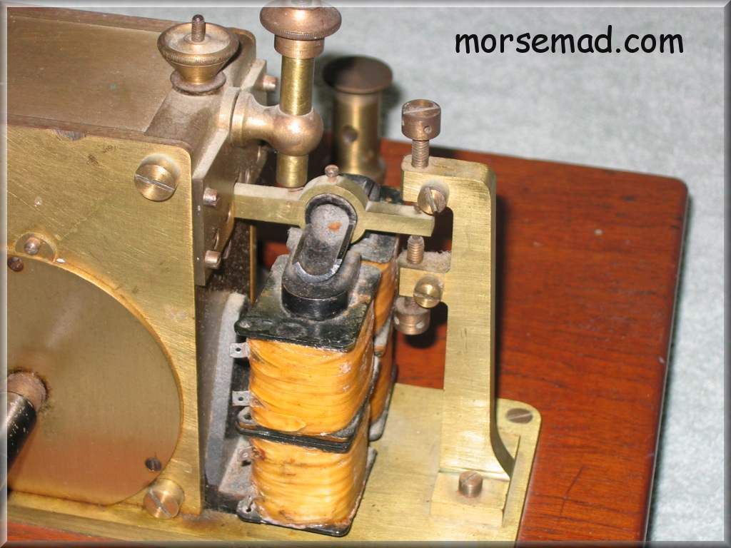 INKER W/53 D17/234. The Morse Inker was invented by Thomas John of Vienna in 1854. It has an inked wheel that moves up and down under the control of a sounder. This wheel produces dots and dashes of morse code on the paper tape. The reel of tape is held in a brass revolving cage in the bottom drawer. Note the huge key for winding the clockwork motor.