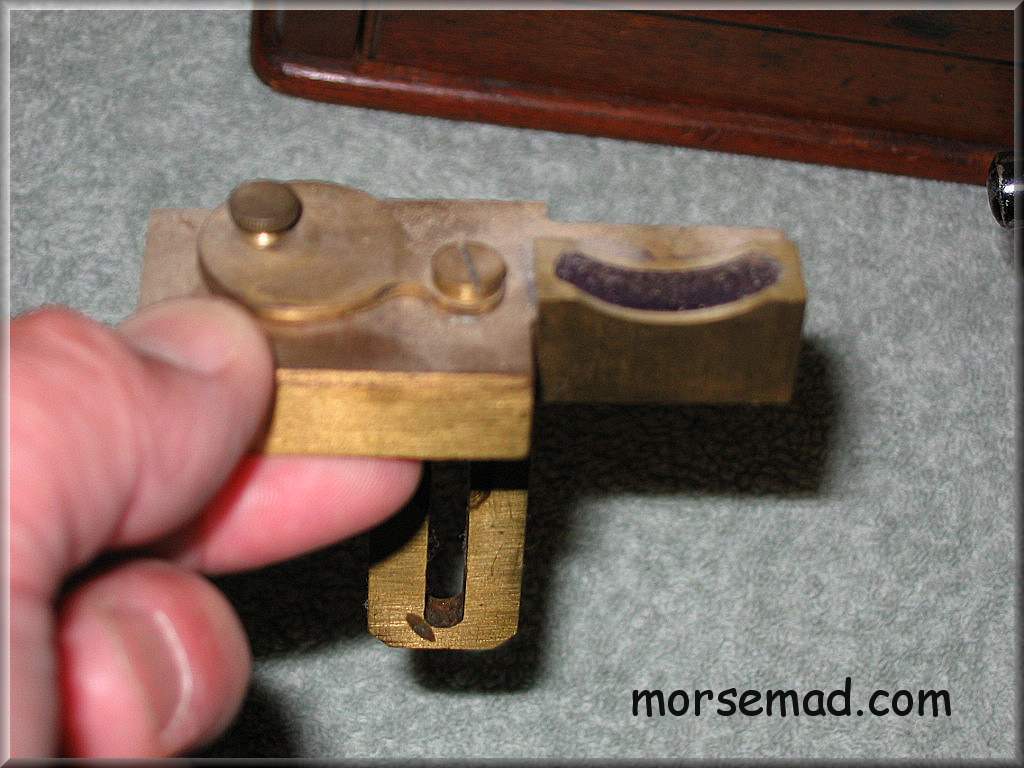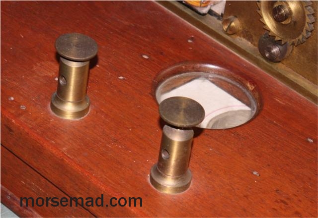 The maker of this Inker is so far unknown, but clues may be in its markings on both brasswork and wooden base of "W/53 D17/234" plus two large terminal posts at 2" (50mm) tall with 1" Dia. (25mm) terminal screws. Also there is a round 2 & 1/2" Dia. (63mm) glass window in the top of the base for viewing the paper roll, paper roll would I think be 6" Dia. and 3/8" wide (152mm by 10mm). The weight is 11.5Kg (26lb).