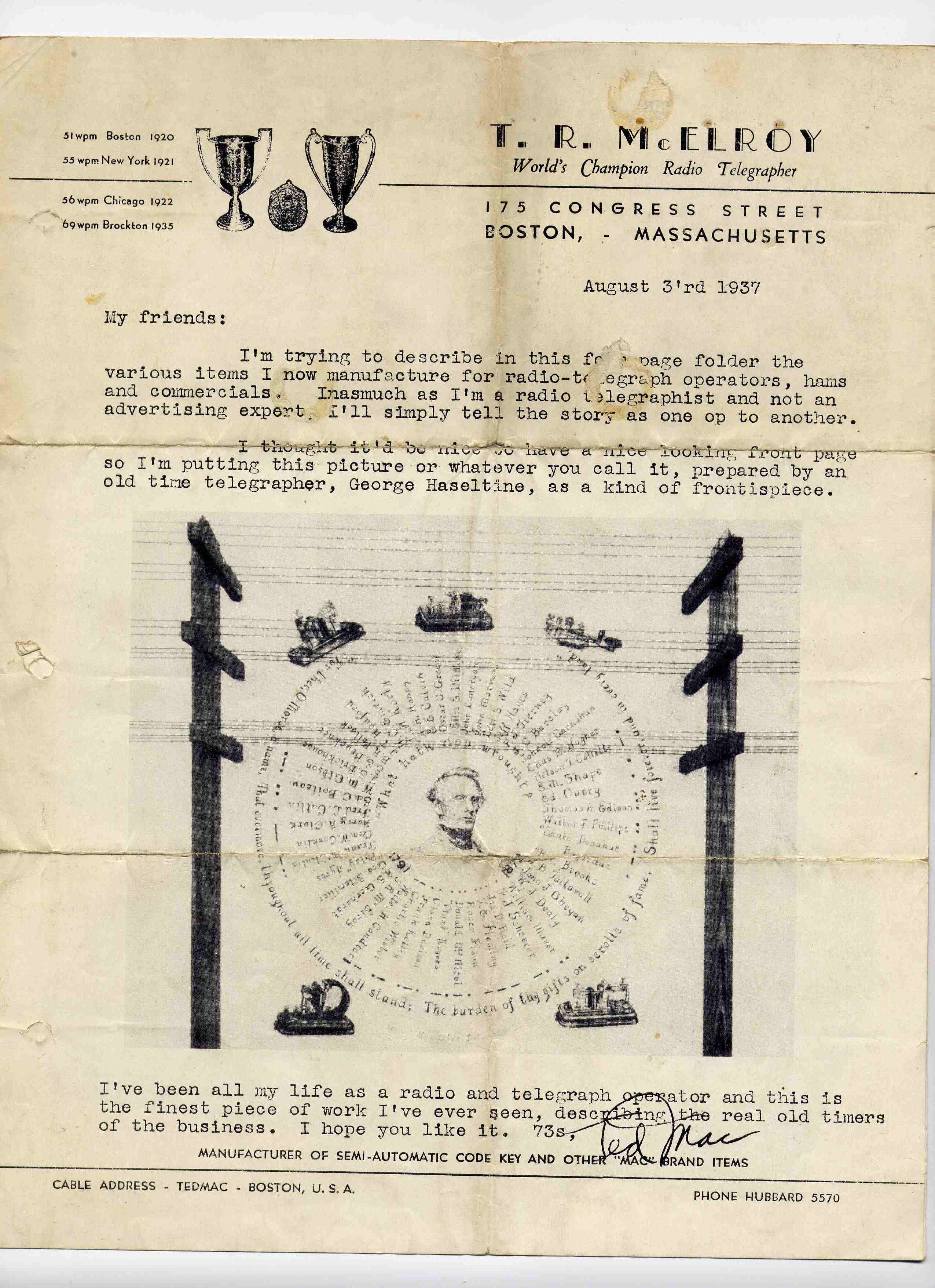 Along the bottom ( Ted - refering to the picture) is typed: "I've been all my life as a radio telegraph operator and this is the finest piece of work I've ever seen, describing the real old timers of the business. I hope you like it. 73s, (signed) TED MAC"