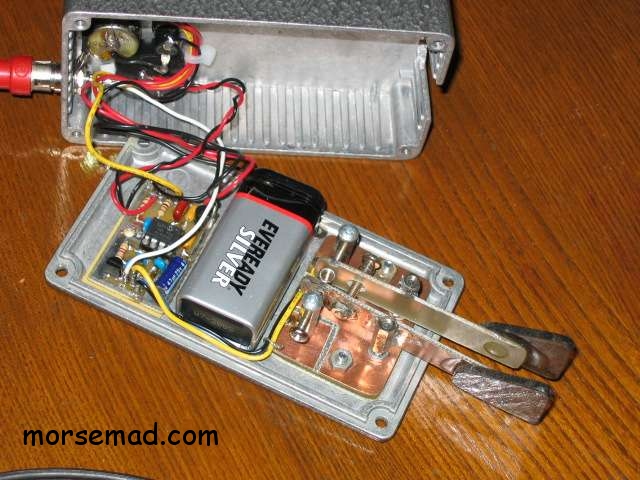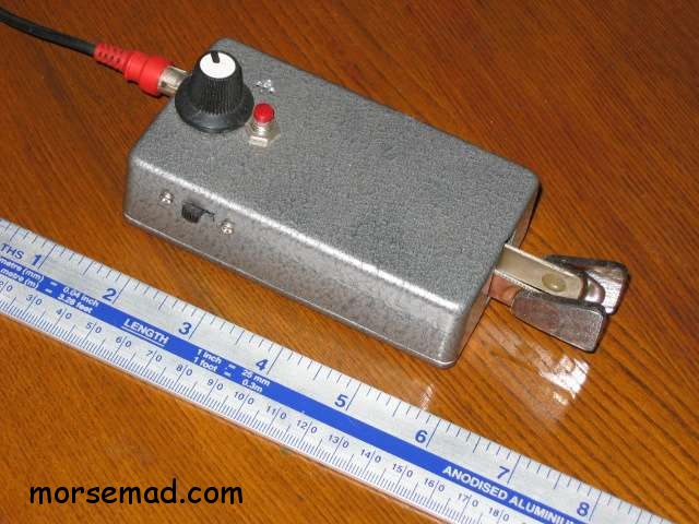 This home made twin paddle morse code key was designed by Steve Taylor / G4EDG. Overall length is about 5.5" (140mm) and made out of bits of copper sided board and odds and ends. The keyer circuit ( a "PK-3") was bought as a kit from Jackson Harbor Press in the USA and has a pot for speed control plus loads of memory functions. Great fun along with my QRP rig.