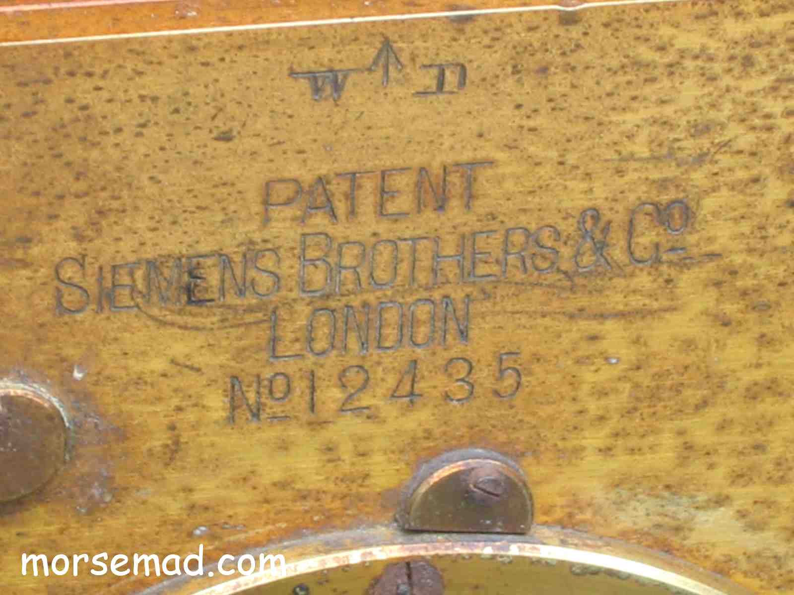 The inscription on the front. "W D" (WAR DEPARTMENT). "PATENT SIEMENS BROTHERS & CO. LONDON No 12435"
